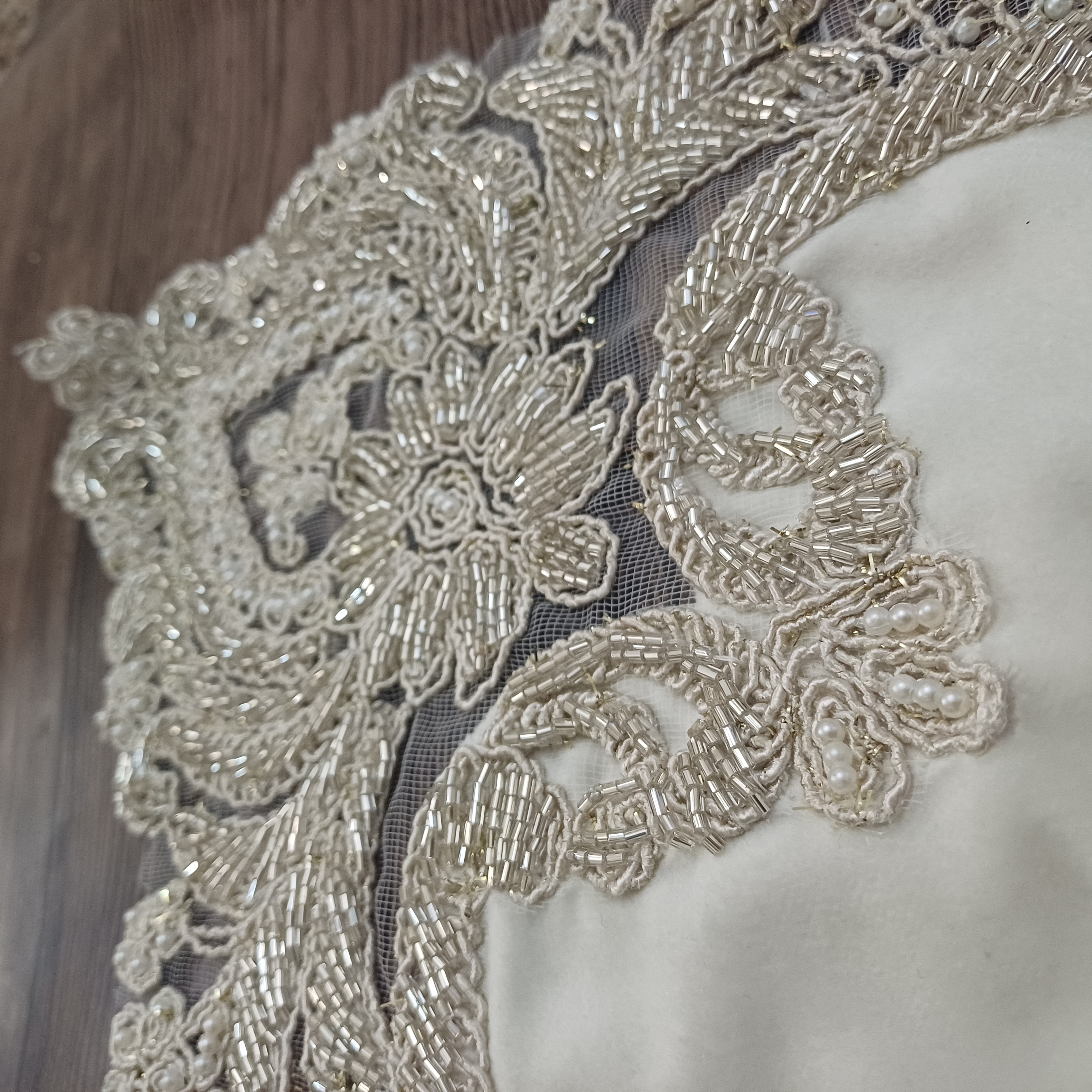 ست سه تیکه رومیزی جلومبلی کارشده با مروارید و ملیله